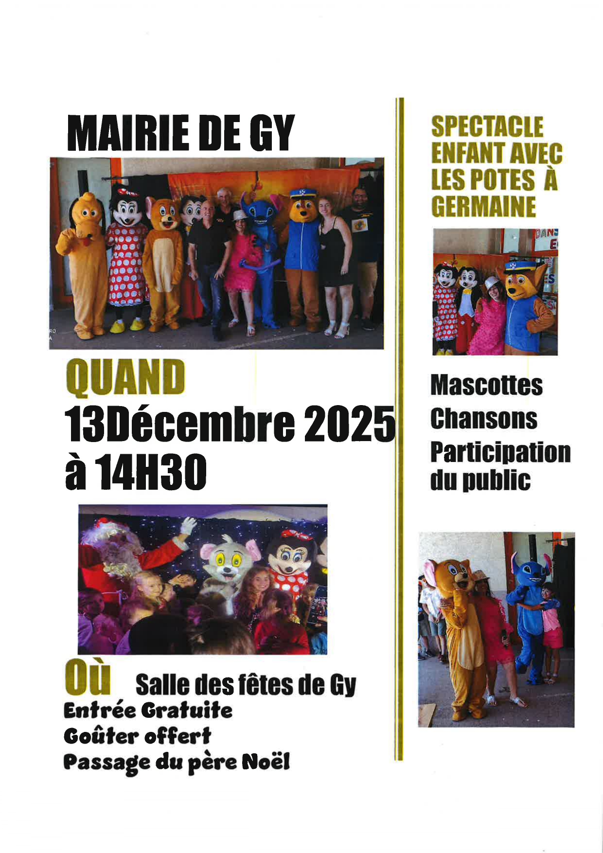 Spectacle de fin d'année pour les enfants avec les mascottes "Les potes à Germaine" , des chansons, goûter offert, passage du père-noël. RV à 14h30 à la mairie. Gratuit.