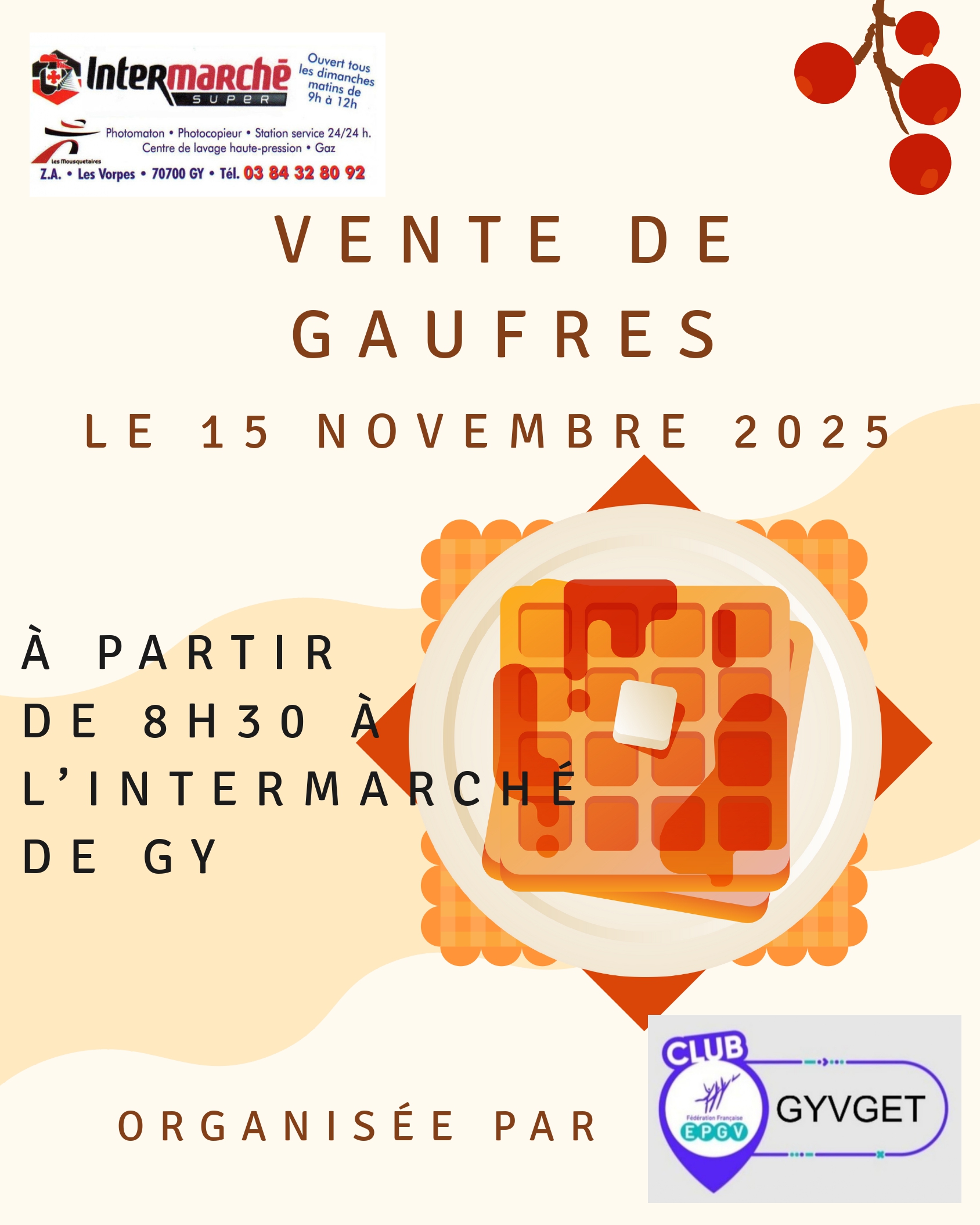 L'association de gymnastique GYVGET propose une vente de gaufres qui se déroulera au supermarché de Gy. A partir de 8h30.