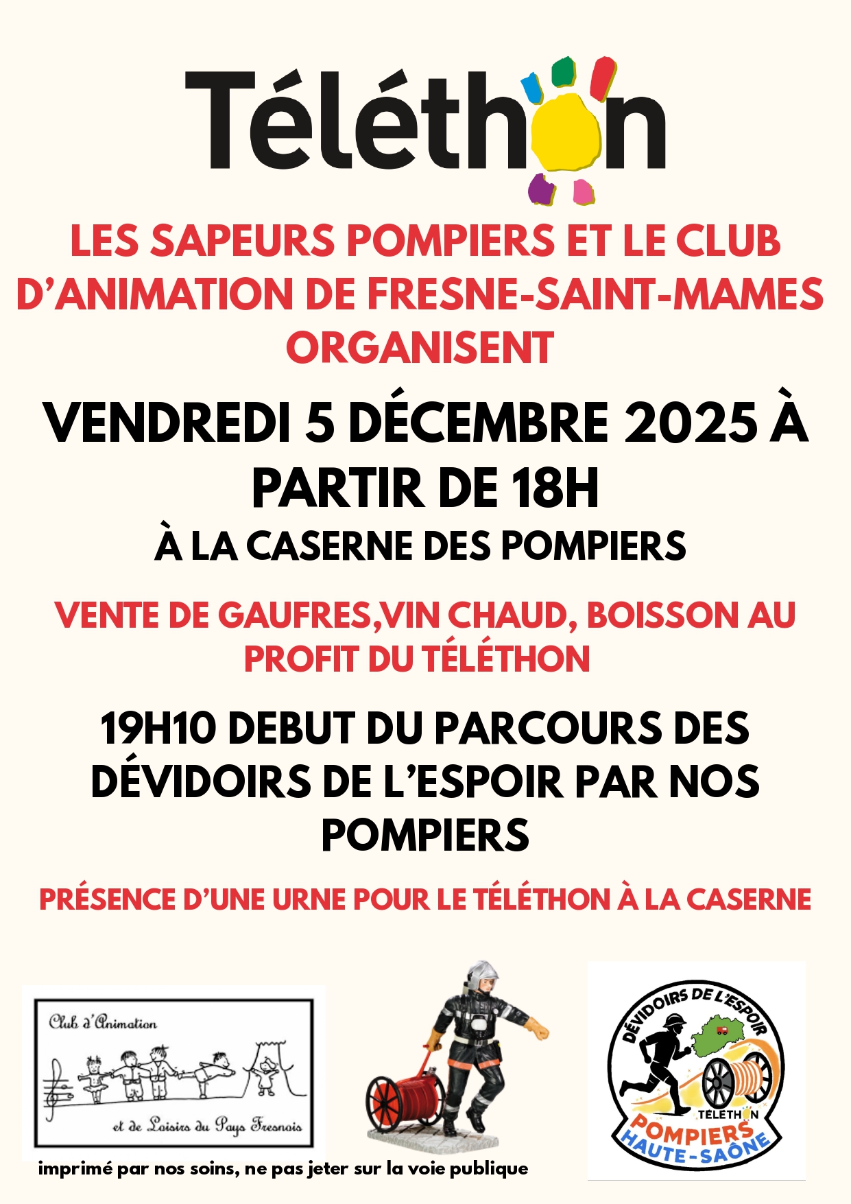 Les sapeurs-pompiers et le club d'animation, organisent une soirée spéciale téléthon à partir de 18h à la caserne. sur place vente de gaufres, vin chaud, boissons au profit du Téléthon. A 19h10 début du parcours des dévidoirs de l'espoir. Urne sur place.